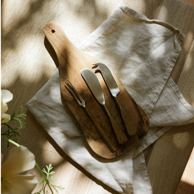 Made from stainless steel with iron handles in a brass finish. Set includes a butter knife a cheese knife and a pickle fork.